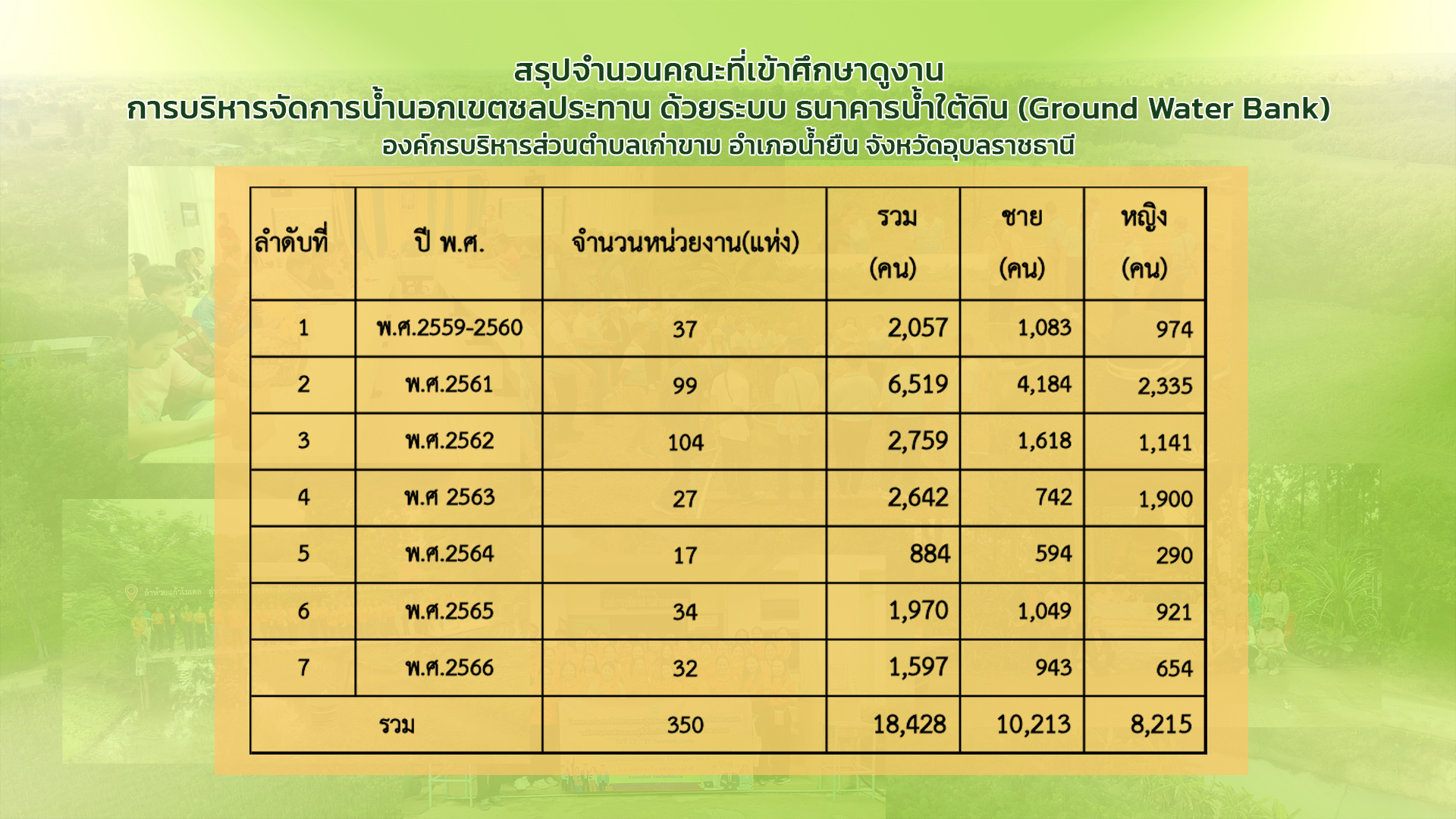 วันพฤหัสบดี, 12 ตุลาคม 2566 10:58สรุปจำนวนคณะที่เข้าศึกษาดูงาน การบริหารจัดการน้ำนอกเขตชลประทาน ด้วยระบบธนาคารน้ำใต้ดิน (Ground Water Bank) องค์การบริหารส่วนตำบลเก่าขาม อำเภอน้ำยืน จังหวัดอุบลราชธานี ตั้งแต่ปี พ.ศ.2559 - พ.ศ.2566 ที่ผ่านมา ได้รับความสนใจจากหน่วยงานราชการ ภาคประชาชนเป็นจำนวนมาก