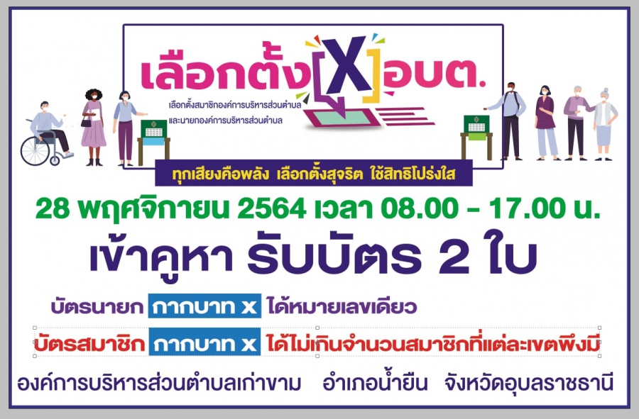 วันศุกร์, 08 ตุลาคม 2564 14:07วันที่ 28 พฤศจิกายน 2564 เวลา 08.00-17.00 น. เลือกตั้ง อบต. ทุกเสียงคือพลัง เลือกตั้งสุจริต ใช้สิทธิโปร่งใส เข้าคูหารับบัตร 2 ใบ บัตรนายก กากบาท ได้หมายเลขเดียว บัตรสมาชิก กากบาทได้ไม่เกินจำนวนสมาชิกที่แต่ละเขตพึงมี