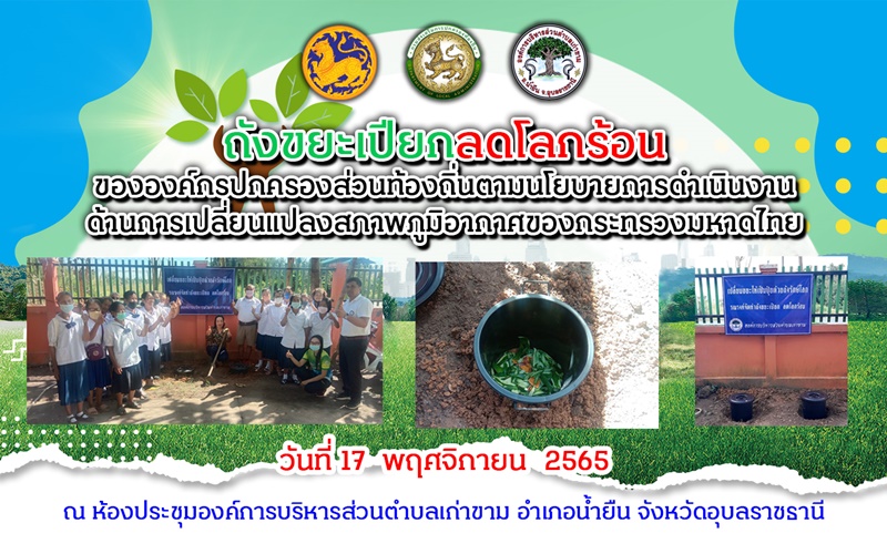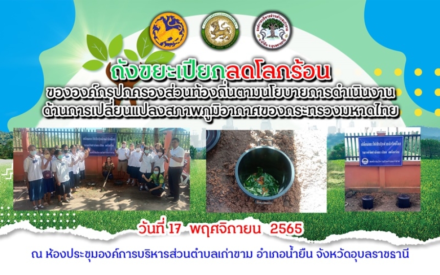 วันศุกร์, 18 พฤศจิกายน 2565 10:06วันที่ 17 พฤศจิกายน 2565 เวลา 09.00 น. นายวิทยา มุลน้อยสุ นายอำเภอน้ำยืน พร้อมด้วย นายนพเมศฐ์ วุฒิศักดิ์สิริ ท้องถิ่นอำเภอน้ำยืน นายพีรดนย์ โรจน์จิรหิรัญ นักส่งเสริมการปกครองท้องถิ่นฯ ได้ลงพื้นที่ อบต.เก่าขาม ในกิจกรรมถังขยะเปืยกลดโลกร้อน ตามนโยบายกระทรวงมหาดไทย โดยมี นายชาตรี๊ ศรีวิชาฐา นายก อบต. นางสาวนิตยตา ผ่องแผ้ว รองปลัด รักษาราชการแทน ปลัด อบต หัวหน้าส่วนราชการ สมาชิกสภาองค์การบริหารส่วนตำบล พนักงานส่วนตำบล พนักงานจ้างร อบต.เก่าขาม และผู้นำชุมชน เพื่อหารือในขัอราชการต่างๆ ตามหนังสือสั่งการฯ และเตรียมความพร้อม ร่วมกิจกรรมถังขยะเปียกลดโลกร้อนขององค์การบริหารส่วนตำบลเก่าขาม เพื่อขับเคลื่อนโครงการถังขยะเปียกลดโลกร้อน ลดก๊าซเรือนกระจก และเตรียมรับการทวนสอบโครงการถังขยะเปียกลดโลกร้อนขององค์กรปกครองส่วนท้องถิ่น ทั้งนี้ อบต.เก่าขาม ได้ร่วมกับนักเรียนโรงเรียนผู้สูงอายุตำบลเก่าขาม ได้สาธิตการทำถังขยะเปียกลดโลกร้อนด้วย